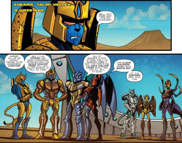 アラクニアの声かけにより集められた種族の代表達が、スペースブリッジの前で議論してるところにサイバトロンの親善大使のラットルが話し合いのできる代表を探しに現れます。