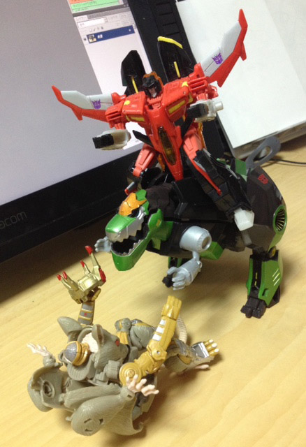 グリムロックといえば、背中に乗せて遊びたくなるので色々乗せてあそんでます。
