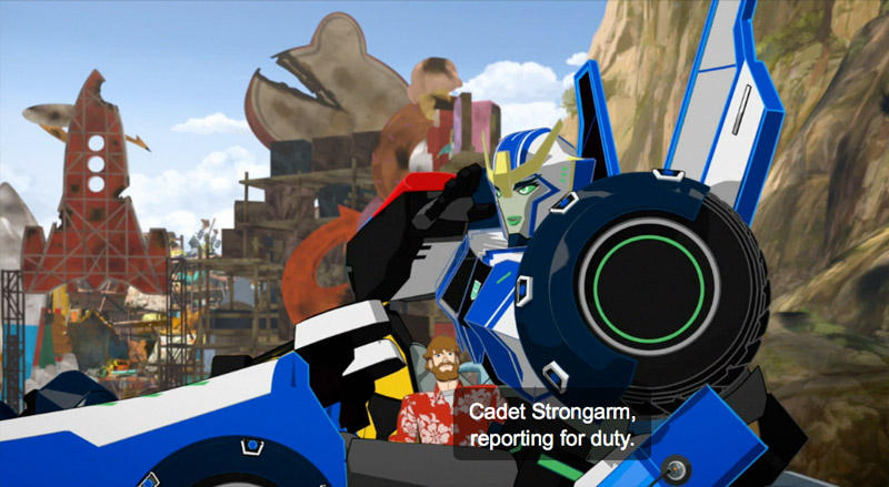 そこにスペースブリッジからオプティマスから「なんとなく行って」と言われてバルクヘッドがやってきました。チームの惨状を見て驚くバルクヘッド。